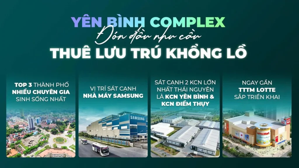 Gần các khu công nghiệp lớn: Chung cư Yên Bình Complex Thái Nguyên nằm Ngay KCN Yên Bình – một trong những khu công nghiệp trọng điểm của tỉnh Thái Nguyên, thu hút lượng lớn công nhân, kỹ sư, và chuyên gia làm việc tại đây.