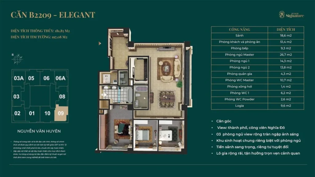 Được định vị là phân khúc hạng sang, Hanoi Signature sẽ mang đến cho những chủ nhân tinh hoa không gian sống hoàn hảo với nội thất cao cấp được lựa chọn kỹ lưỡng từ các thương hiệu danh tiếng, thiết kế tinh tế và tiện nghi hiện đại.