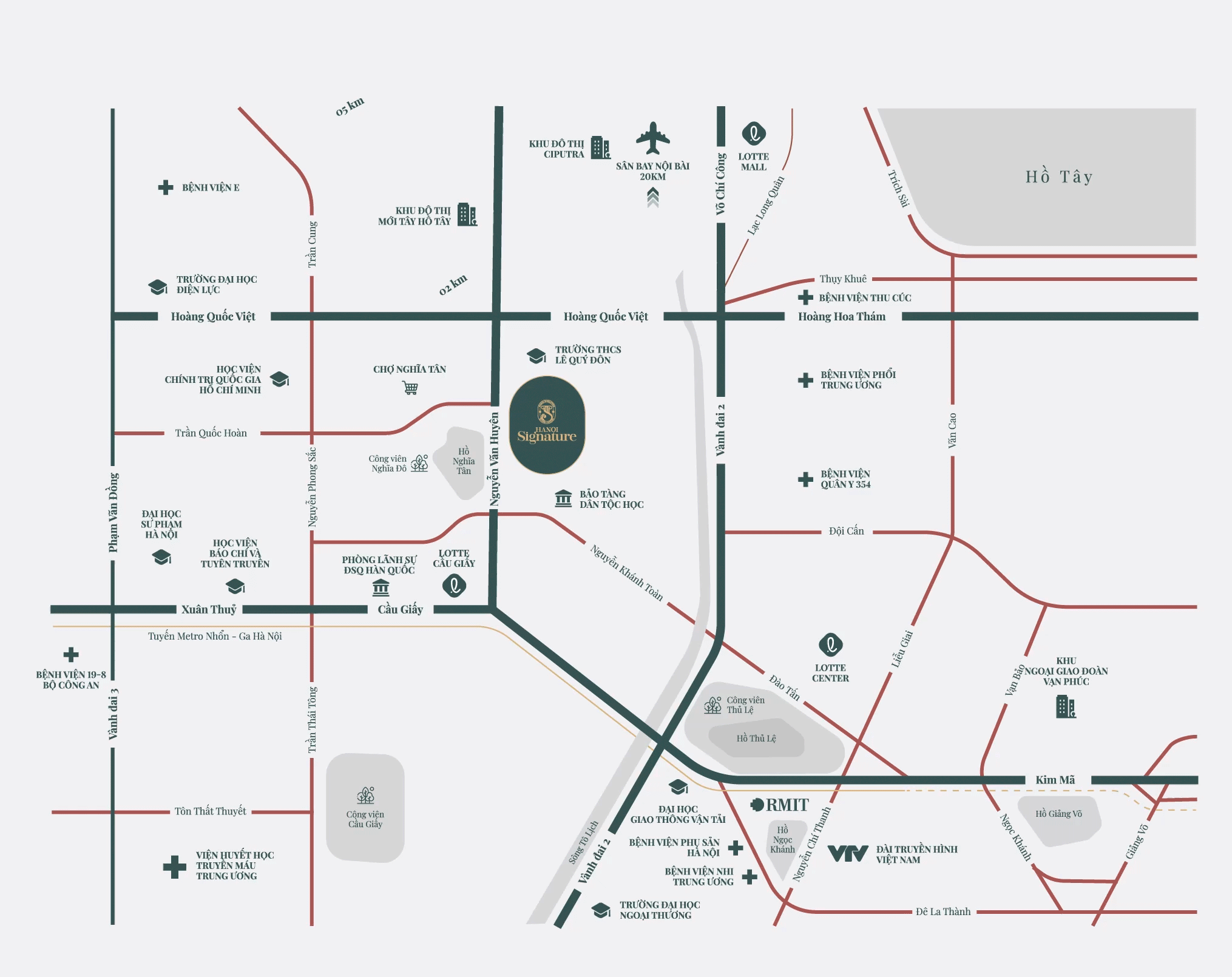 Không chỉ dừng lại ở đó, Hanoi Signature còn kết nối thuận tiện với các trung tâm kinh tế, văn hóa và giải trí quan trọng của thành phố như Trung tâm Ba Đình, trung tâm hành chính mới Tây Hồ Tây, Hồ Tây thơ mộng, Lotte Mall West Lake sầm uất và chỉ cách sân bay Nội Bài 30 phút di chuyển.